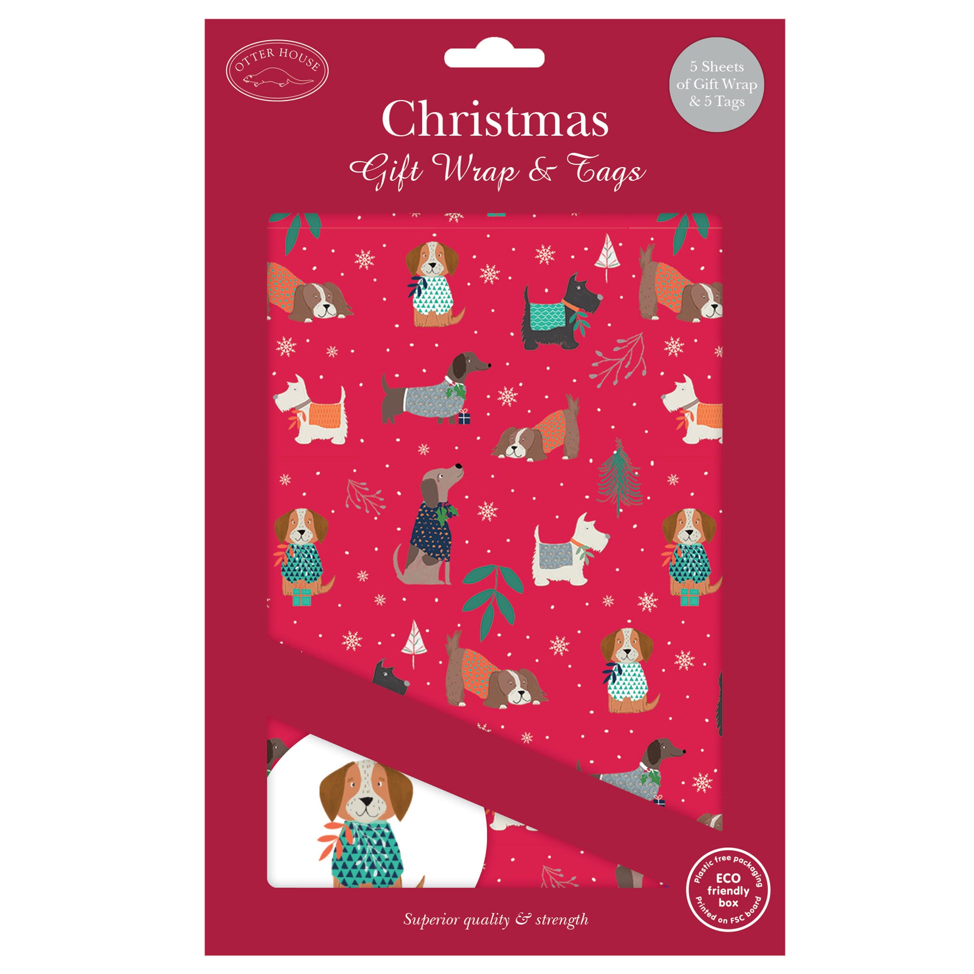 Luxury gift wrap with a colourful, festive dog design.