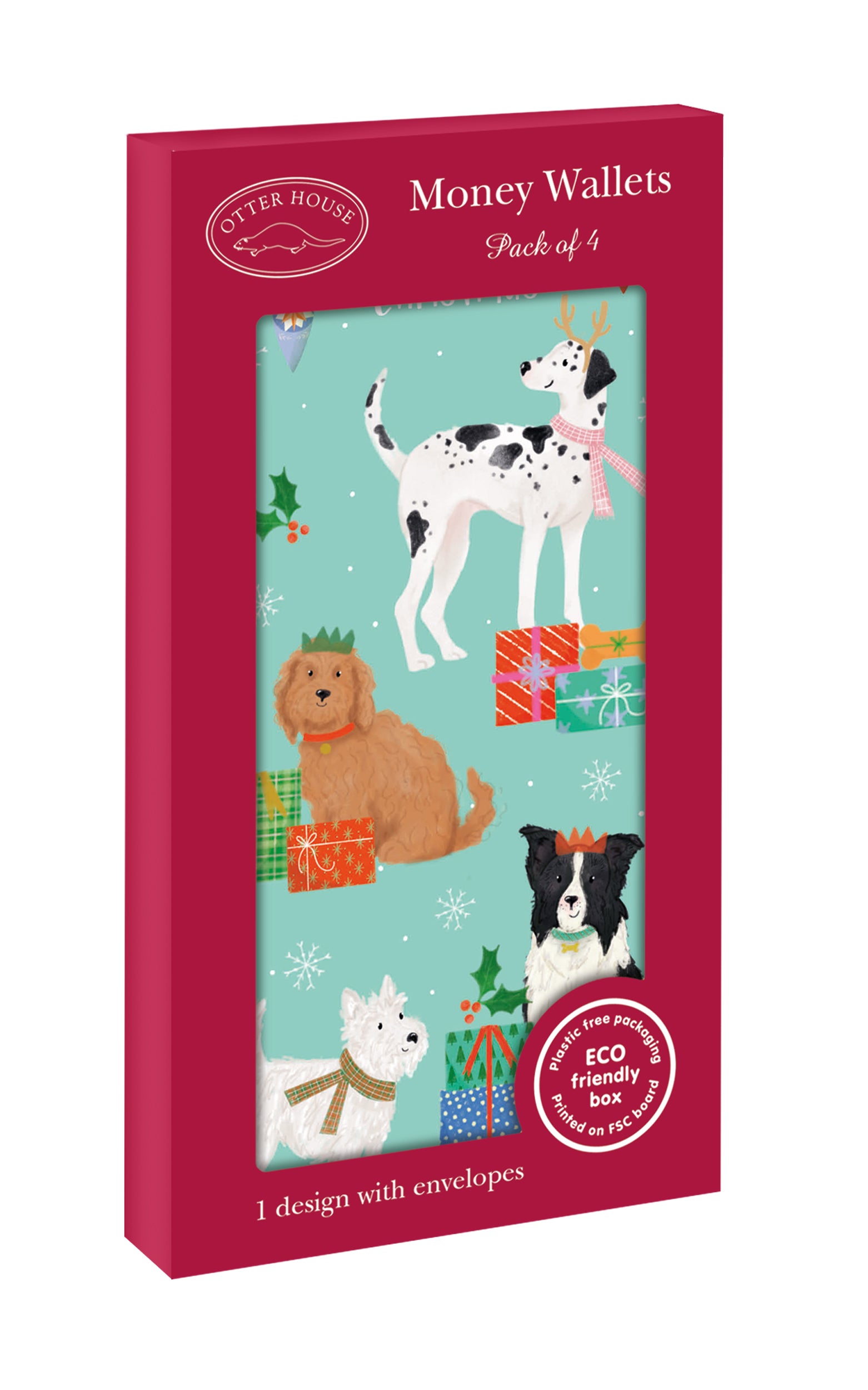 A pack of four cards including slots to store a cheque, banknote or voucher, with envelopes.