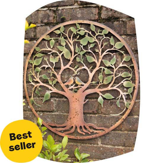 Two birds nestle amongst the heart shaped branches of this rustic, metal plaque.