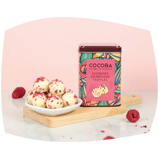 Gift tin filled with 120g of white chocolate truffles with Marc de Champagne and freeze dried raspberries.