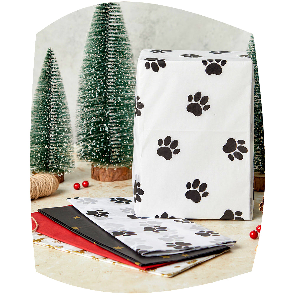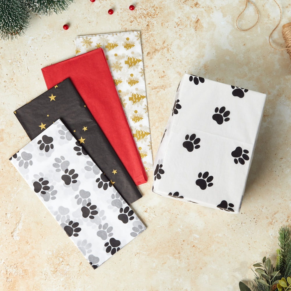 12 sheets of tissue paper with festive designs plus a fun paw print design.