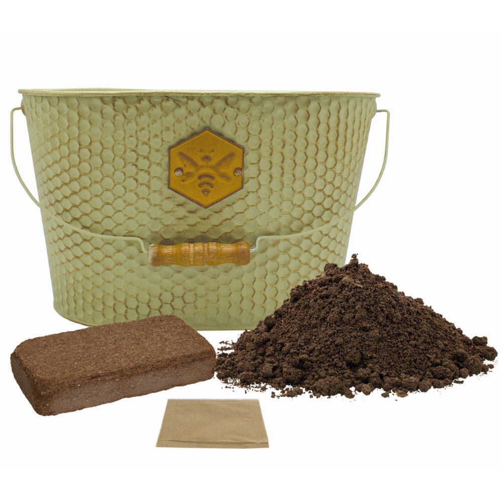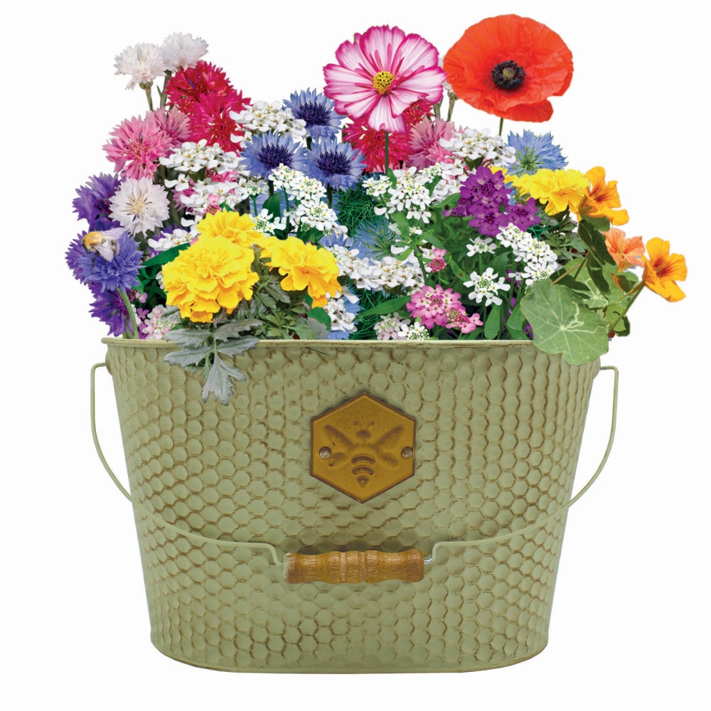 Outdoor trough planter with honeycomb and bee design with vibrant pollinator wildflower seeds and growing medium.