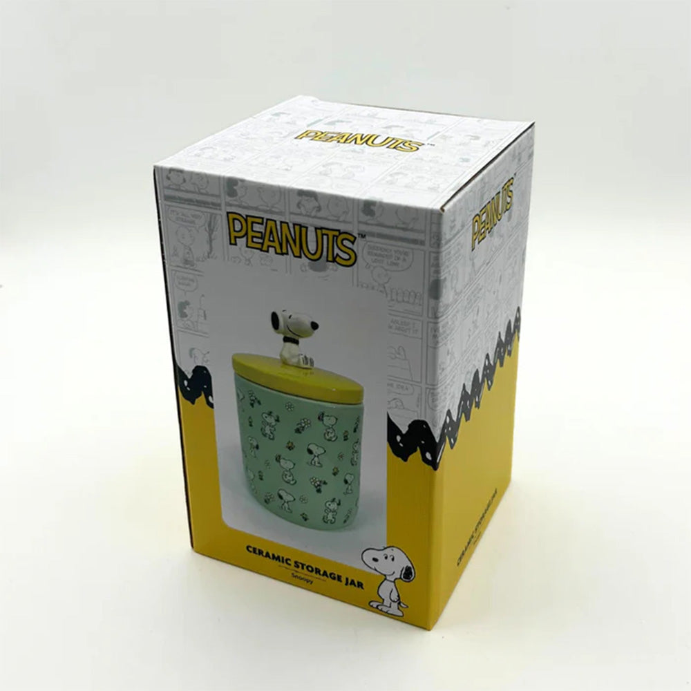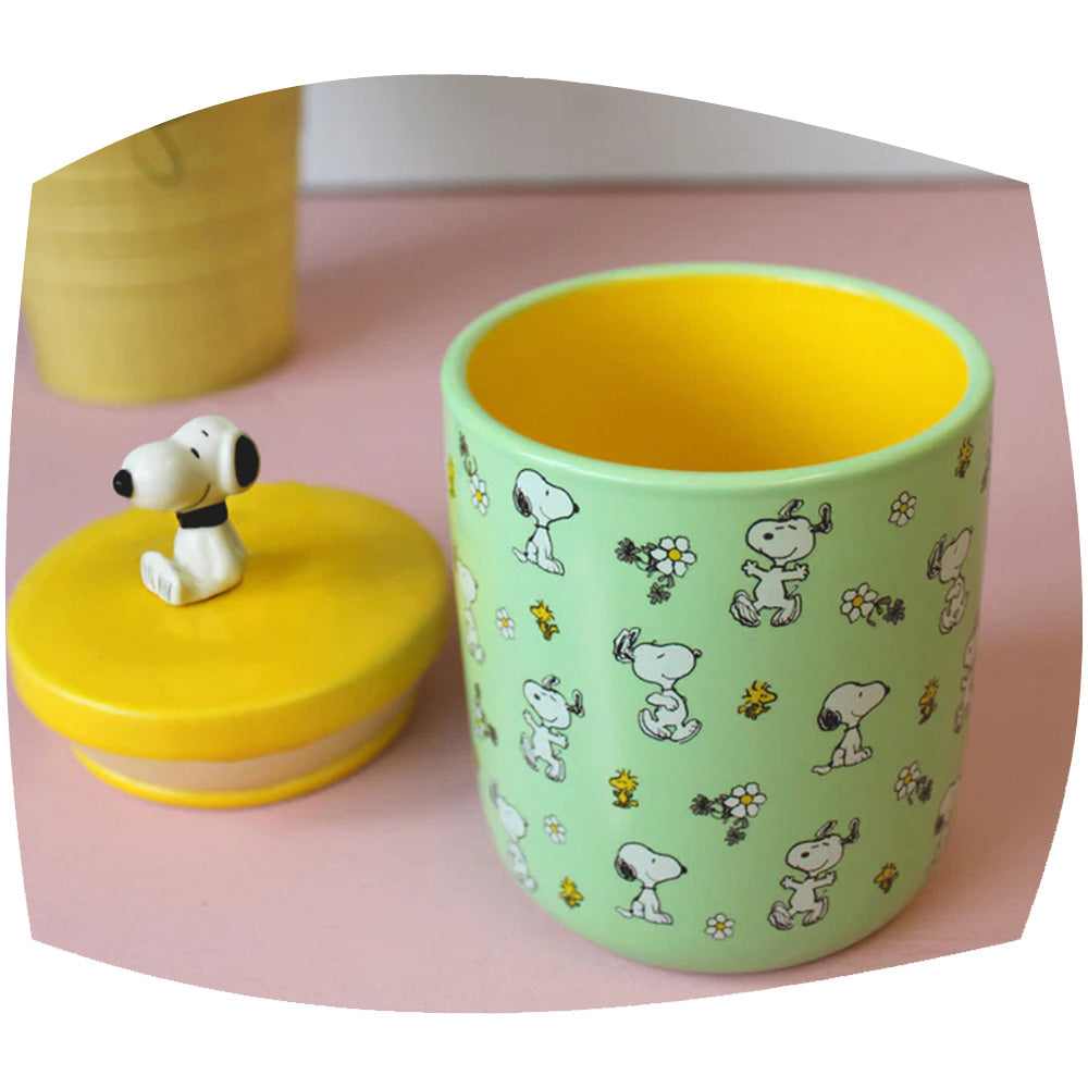 This sweet ceramic jar is the perfect place to store treats for your pup! Featuring an all-over print of iconic Peanuts character Snoopy, this little jar is finished with a ceramic snoopy sitting on the lid. The inside and lid are bright yellow, and there is an air-tight seal around the rim of the lid to keep treats fresh.