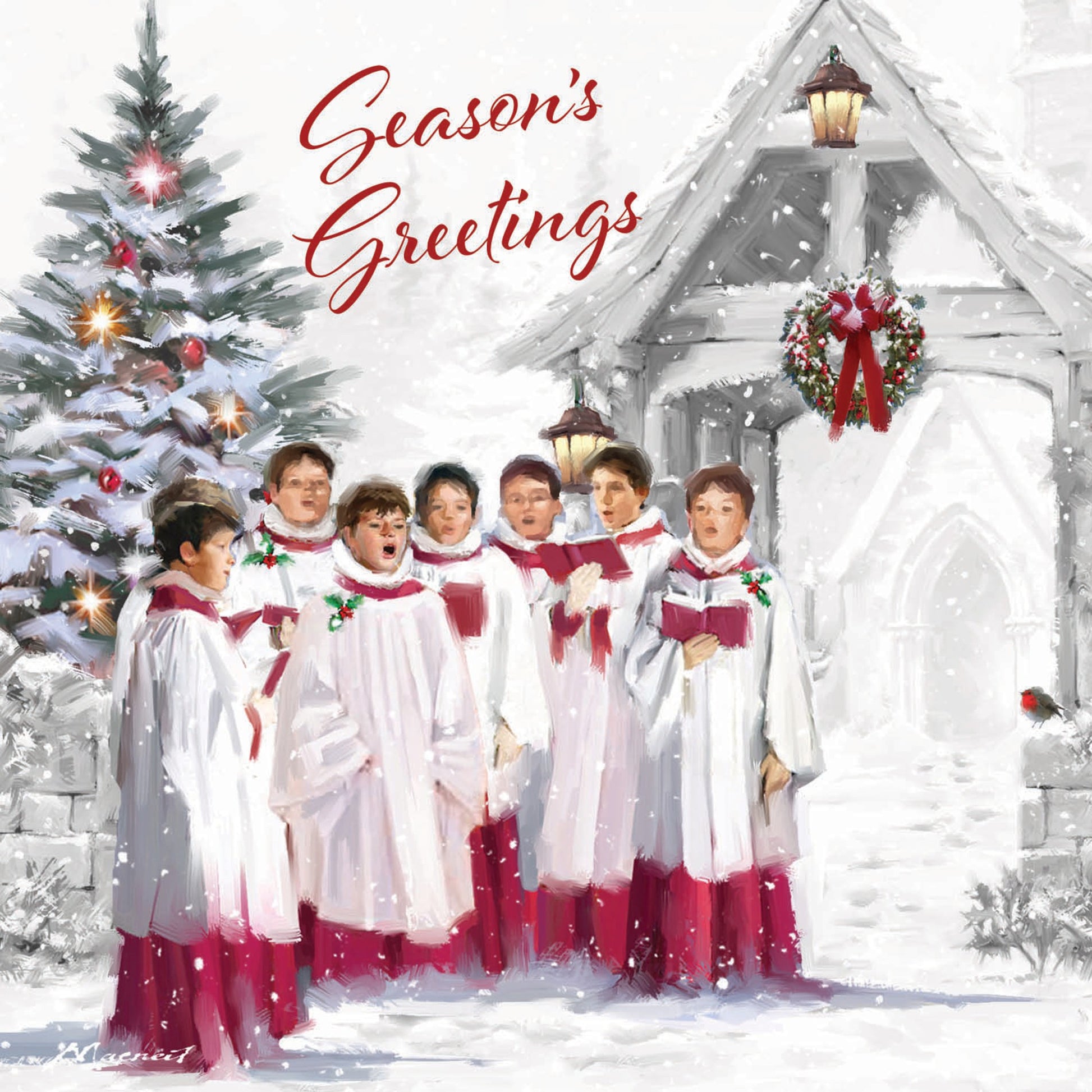 A lovely Christmas card featuring Choristers singing carols outside of a churchyard.