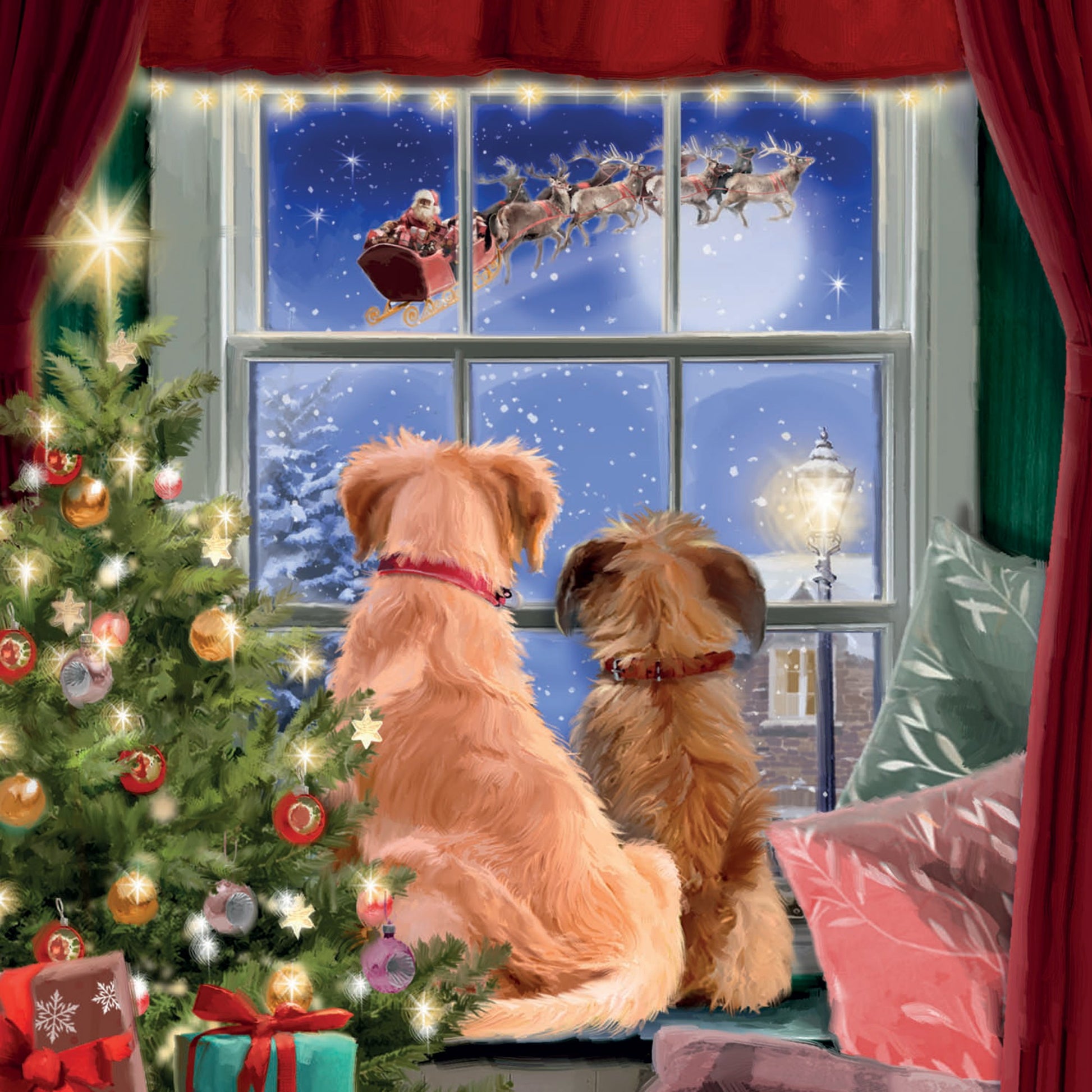 A stunning square Christmas card featuring dogs looking in wonder as Father Christmas flies by on his sleigh!