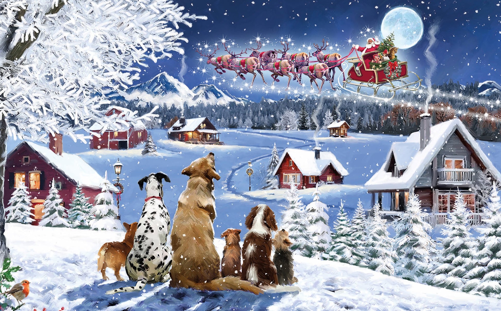 This beautiful design by Richard MacNeil features several dogs including a Dalmatian, Yellow Labrador and Cocker Spaniel, all watching in wonder as Santa flies by. A lovely card to delight any recipient.