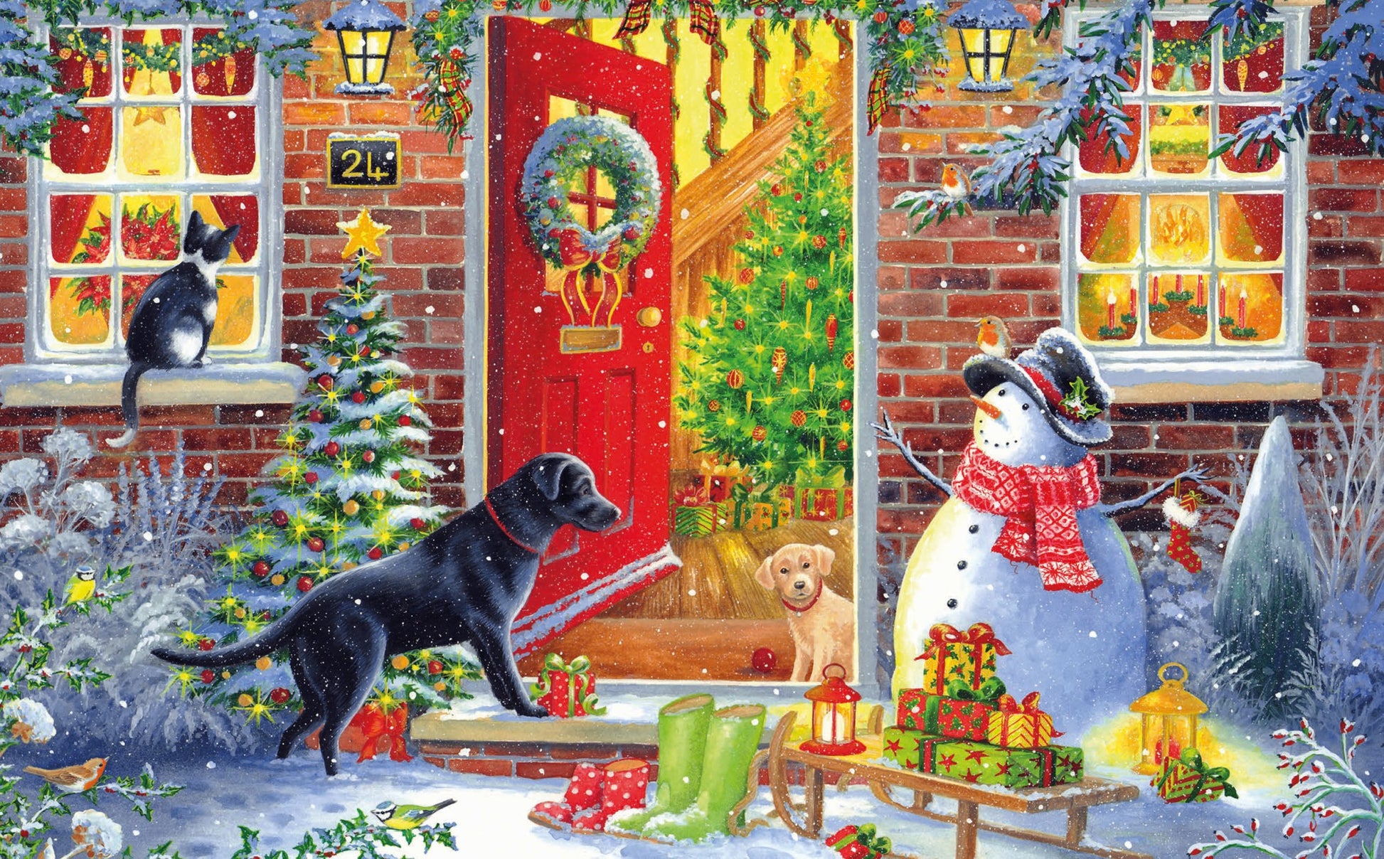 A gorgeous Christmas scene featuring a Black Labrador and his snowman friend!