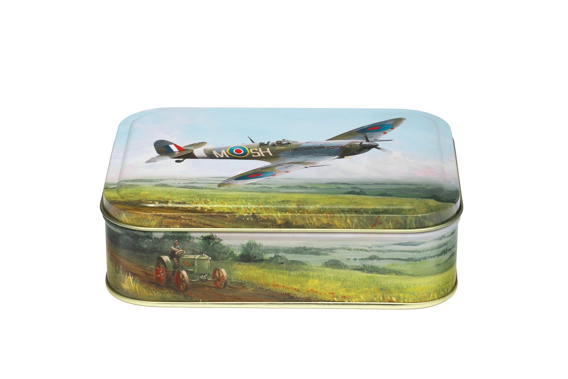 Keepsake tin featuring an iconic Spitfire illustration by Derek Blois and filled with 125g of Honeycomb Crunch.