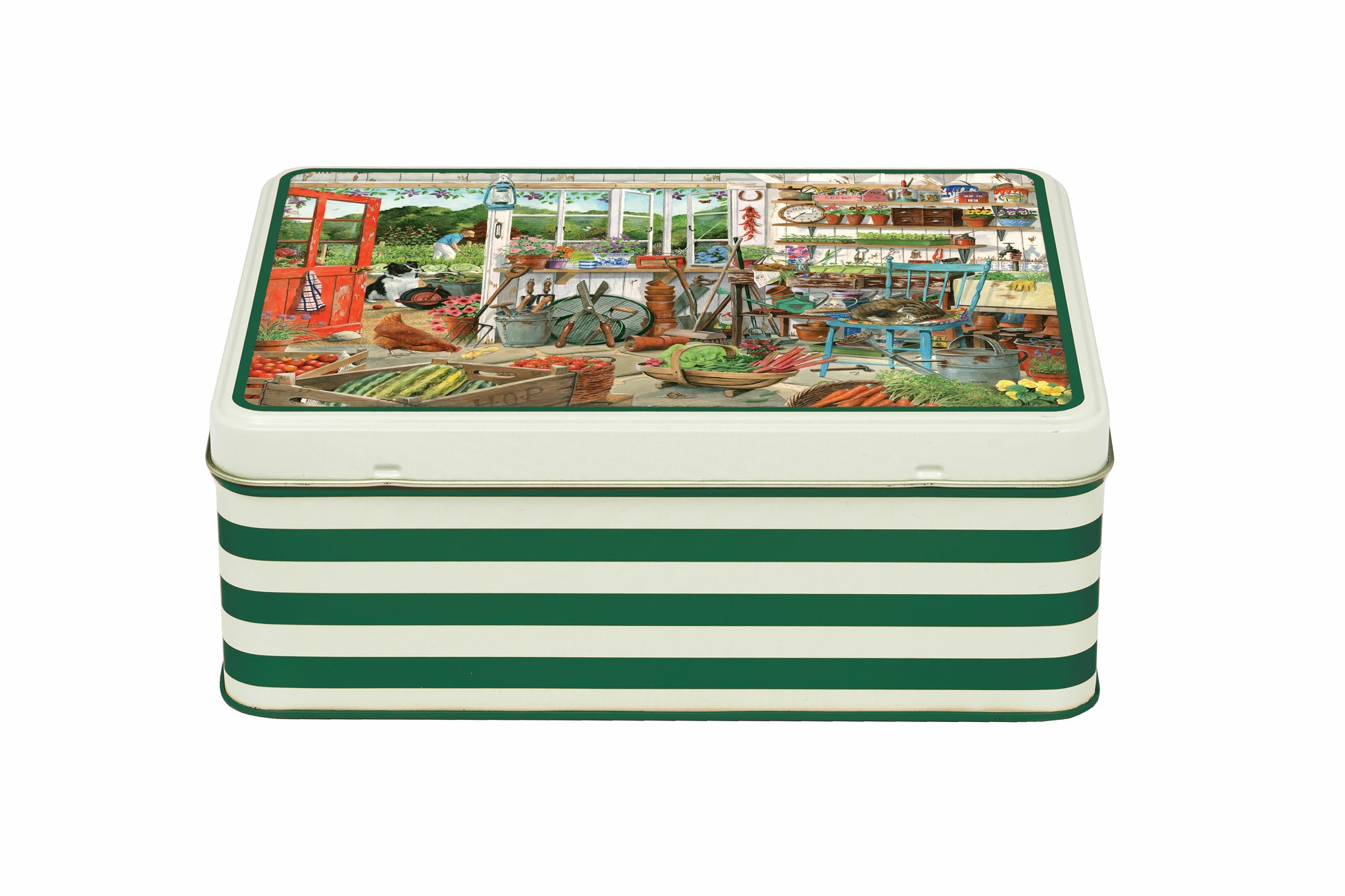 Keepsake tin featuring a border collie peeping into a busy garden shed where a cat is taking a nap.