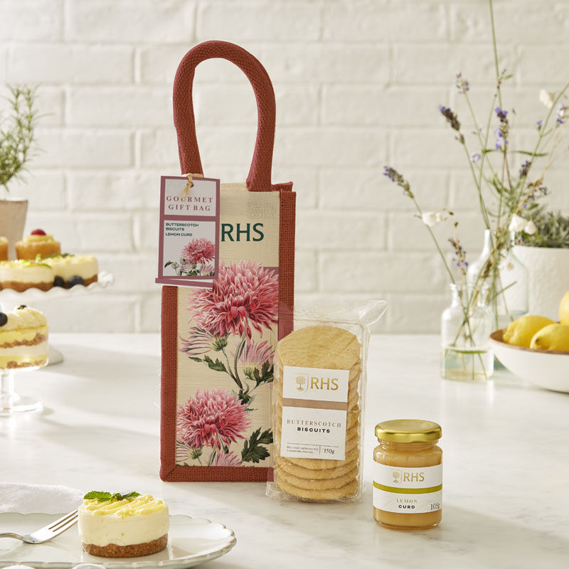 Floral jute bag with 150g butterscotch biscuits and 105g lemon curd for an ideal gift.