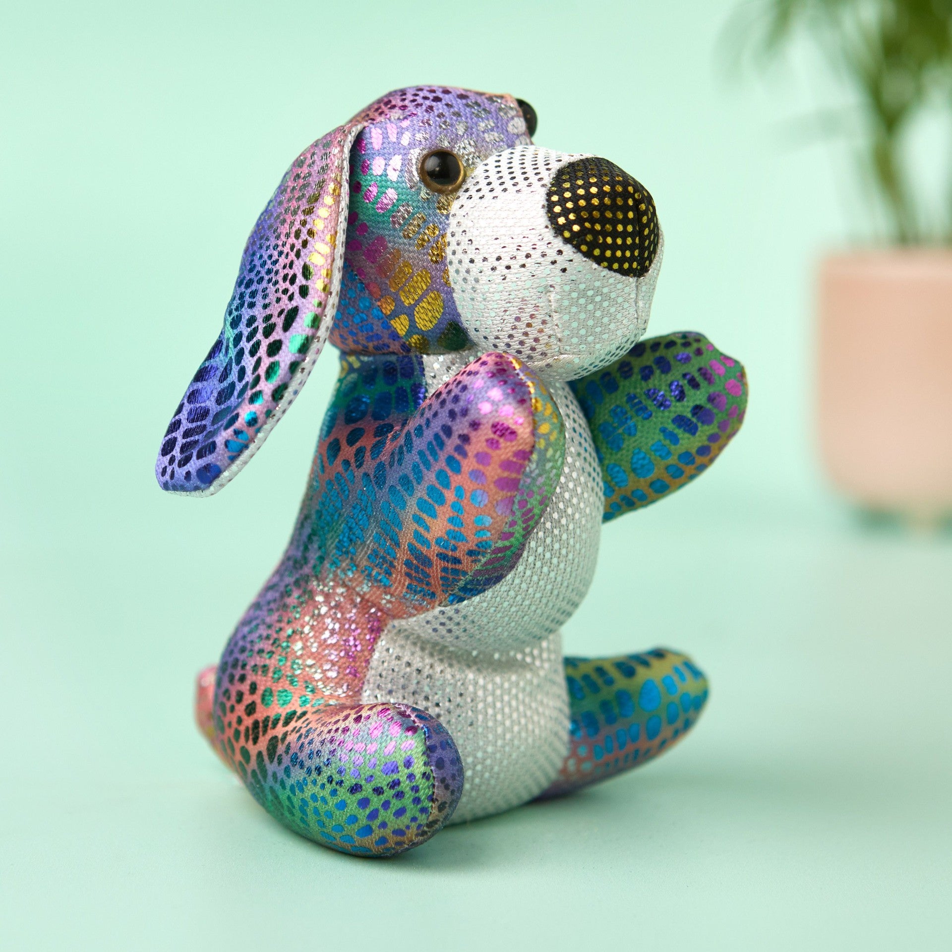 Cute pup filled with sand to use as an ornament or paperweight.